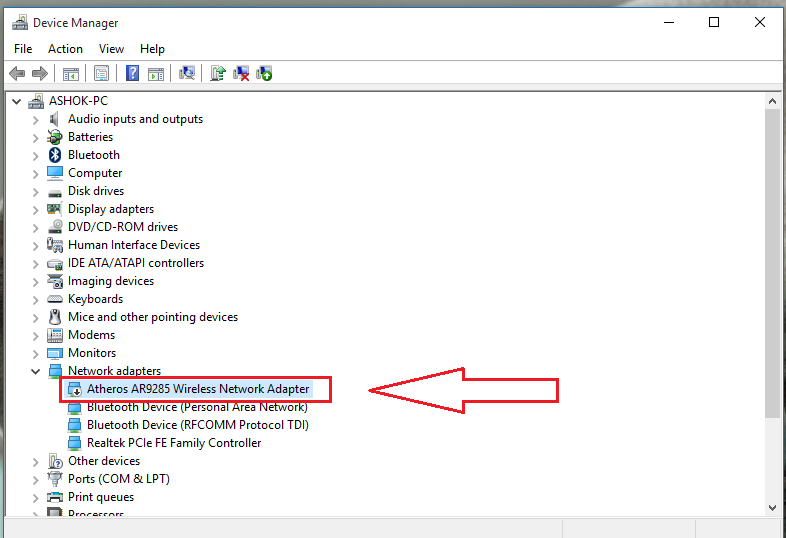 3) Click on Network adapters, Select Wireless Network Adapter (you can see the signal of one that has the down arrow and left click the one that)