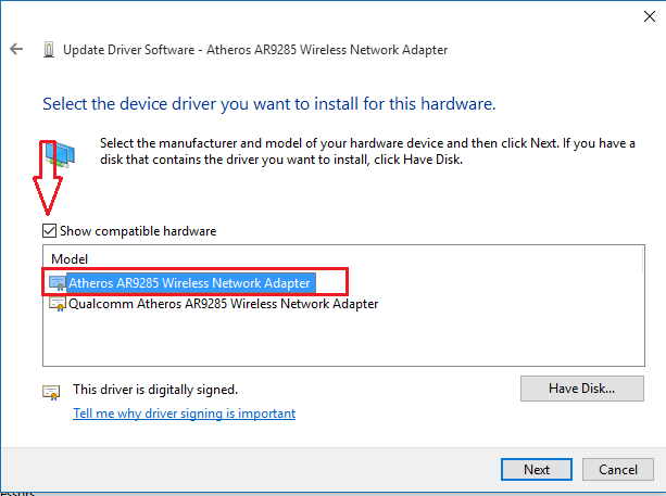 7) Now you need to mark on “show compatible hardware”, This will show you only compatible wireless network adapter.