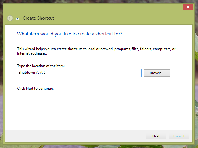 • You will see a Create Shortcut Window, now on the location filed type shutdown /s/t 0