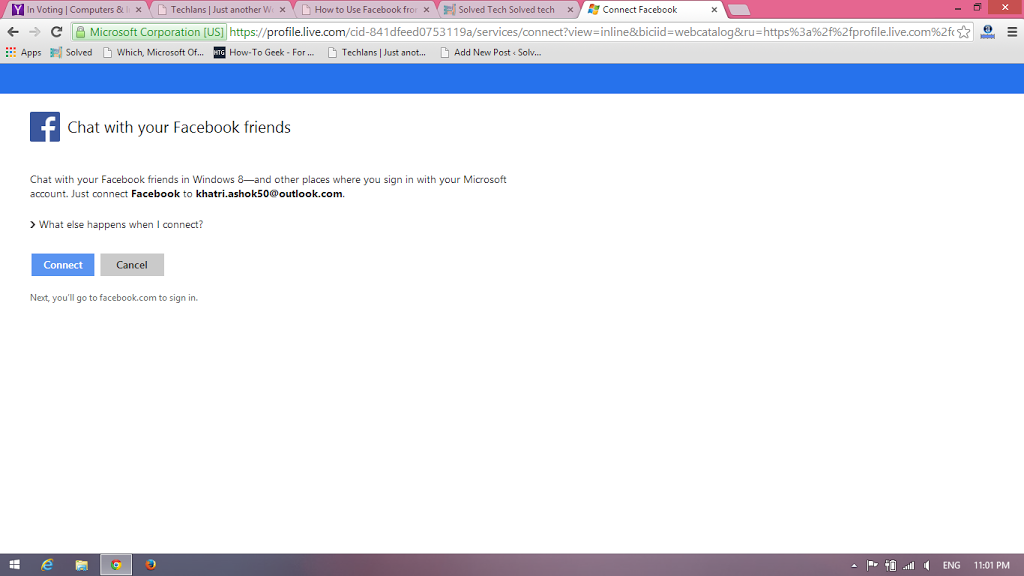 Finally click on OK button to integrate with outlook. You’re done, your Facebook account is now integrated with your outlook account.