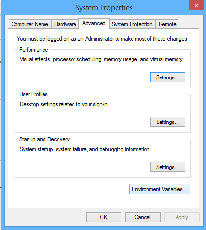 • After opening Advanced system setting click on Advanced tab and select Environment Variables